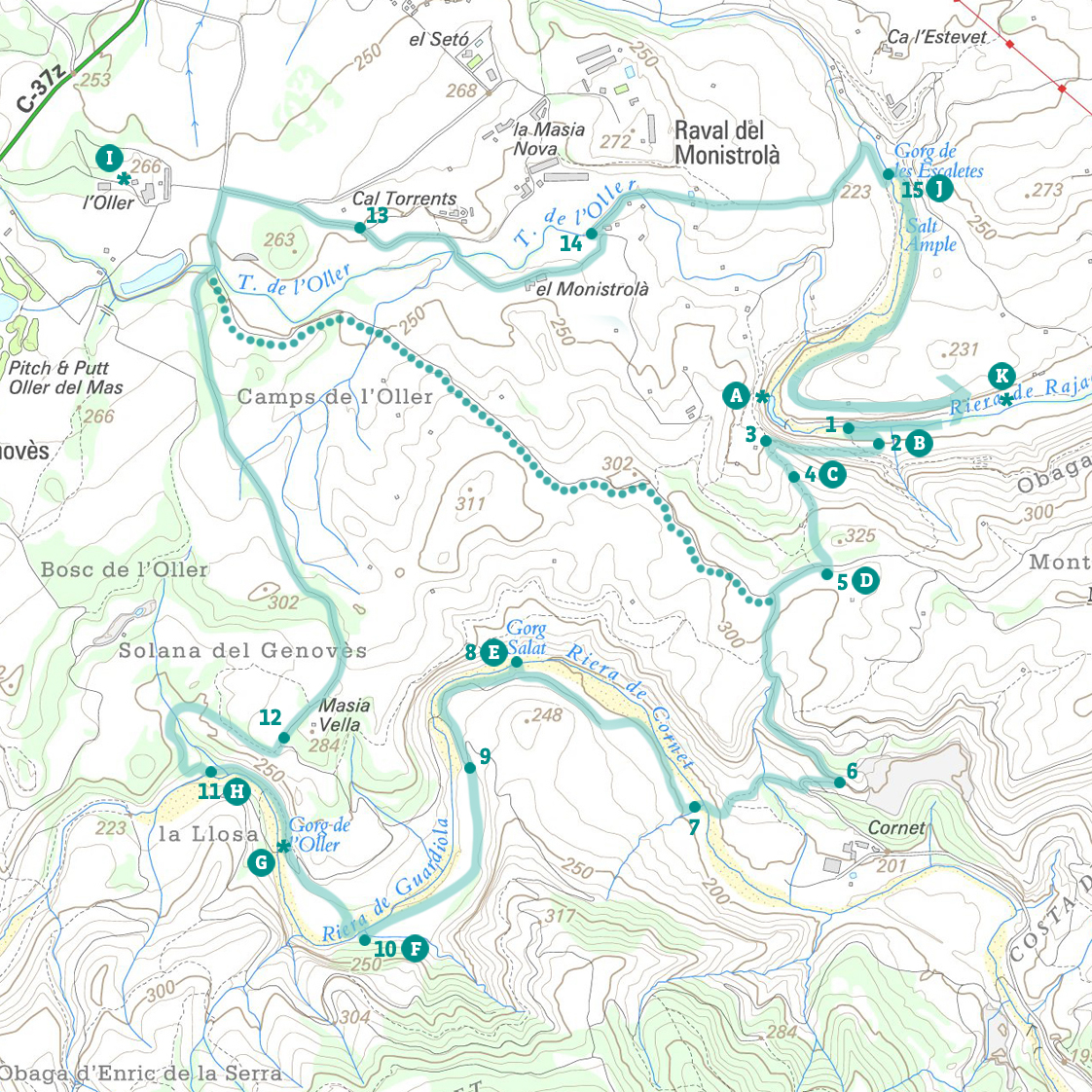 Cal anar amb compte en moments que el cabal de les rieres és alt, perquè podem tenir dificultats per a travessar-les sense mullar-nos els peus.