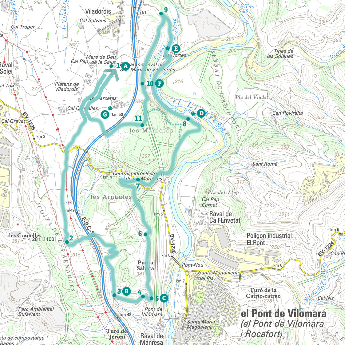 Els cingles del Llobregat (M5)És un trajecte amb un gran interès natural i paisatgístic, que ens ofereix unes vistes sensacionals sobre el riu Llobregat des del mirador de Punta Sabata i el cingle de Roca Tinyosa. Tot i tenir una part del recorregut molt proper al curs del riu, la presència de trams molt aeris no el fa apte per a persones amb vertigen.