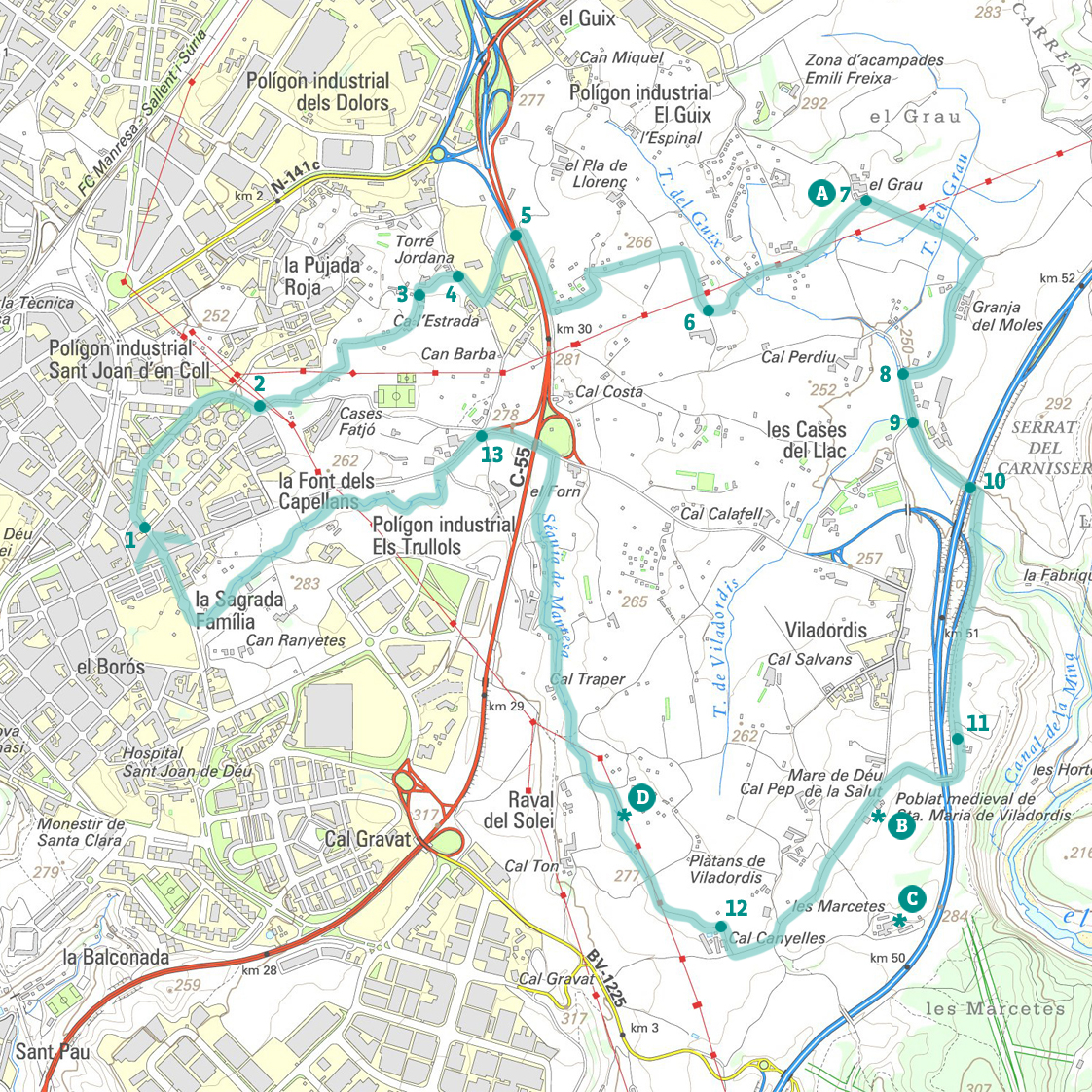 El regadiu de Viladordis (M6)La ruta transcorre al llarg de Viladordis, una de les hortes originades per l'arribada de l'aigua a Manresa a través de la Sèquia, al segle XIV.