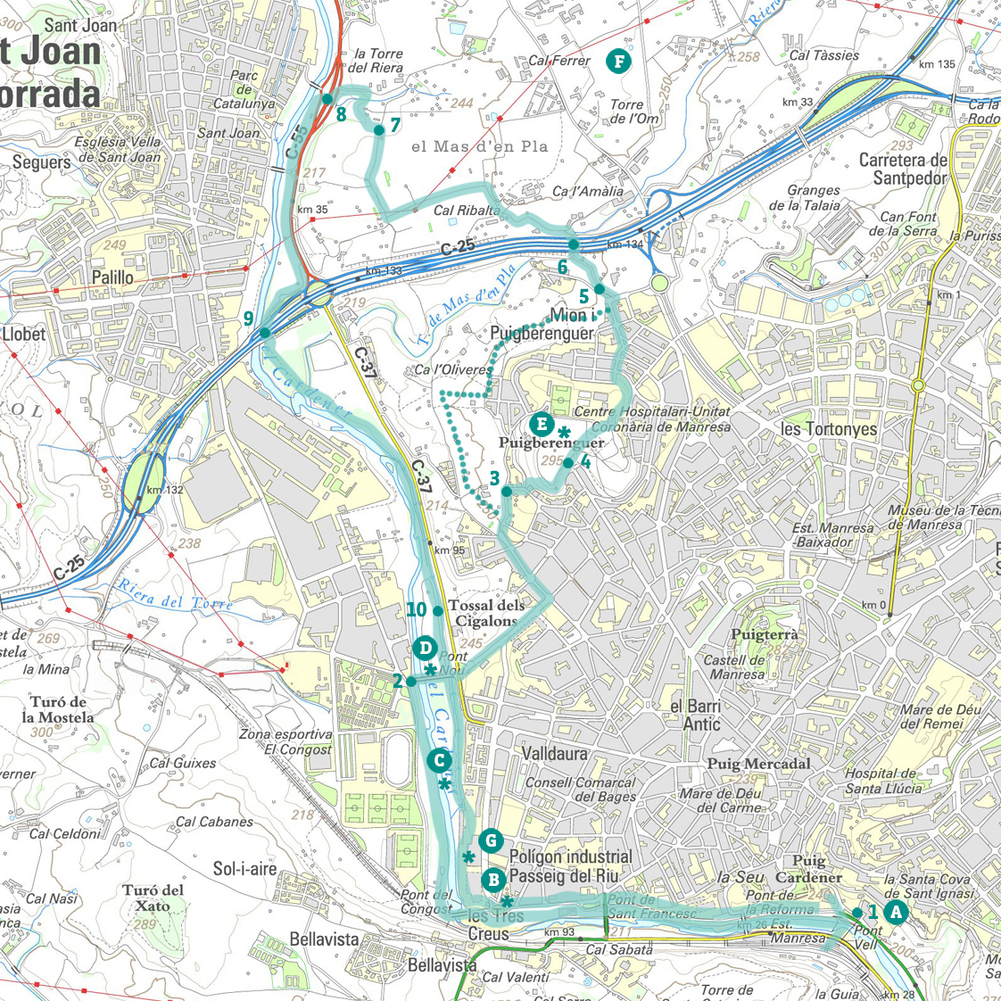 El Cardener i el Puigberenguer (M8)L'itinerari transcorre a la vora del riu Cardener en el seu tram més urbà. El recorregut permet fer aproximacions al riu per gaudir del seu paisatge i veure-hi alguns elements del seu patrimoni cultural: fàbriques, rescloses, ponts...