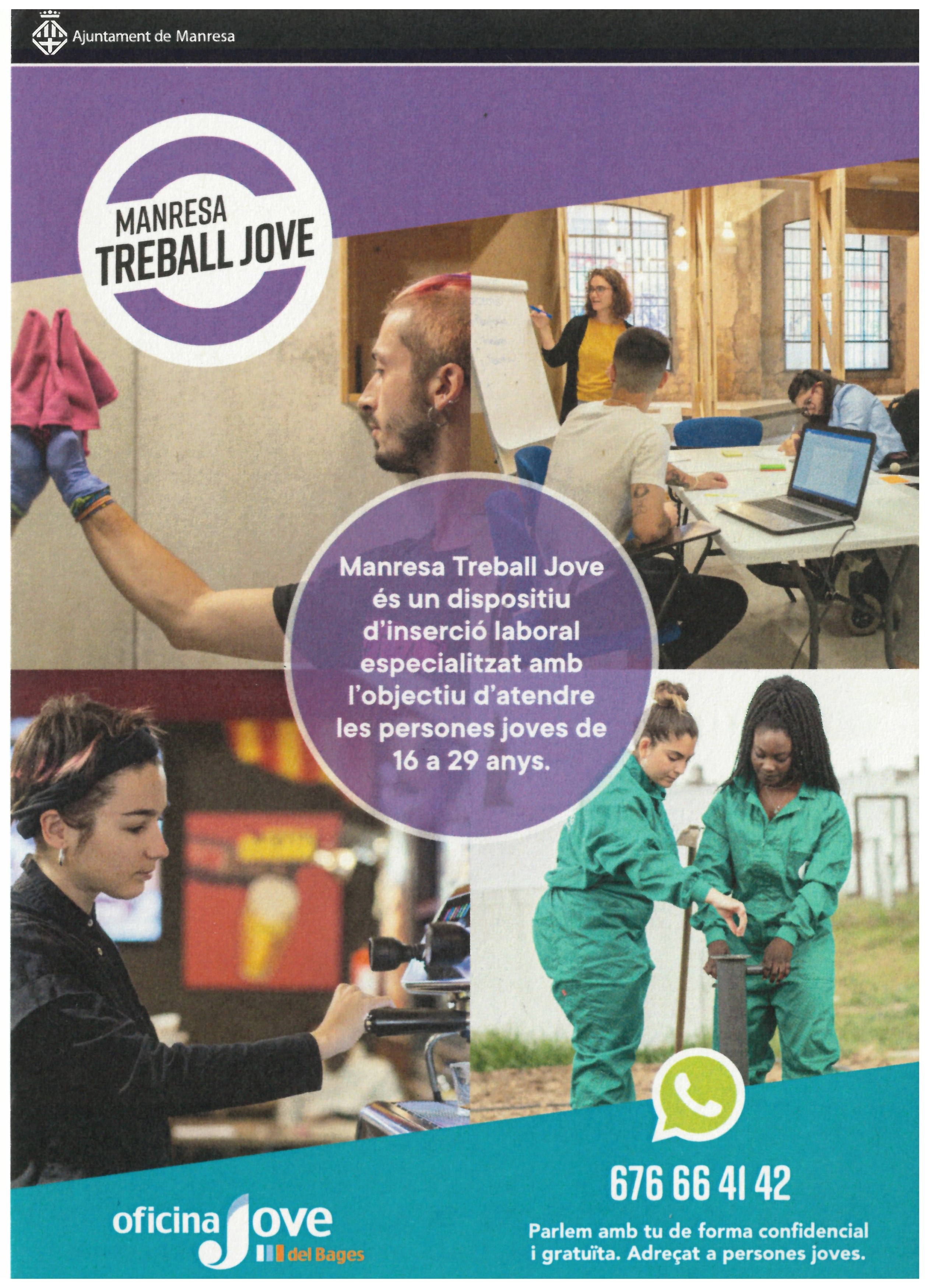 Manresa Treball Jove és un dispositiu d’inserció laboral especialitzat amb l’objectiu d’atendre les persones joves d’entre 16 i 29 anys. Aquesta iniciativa s’ha treballat conjuntament entre la regidoria d’ocupació i el programa de joventut, amb l’objectiu de centrar tota l’atenció de joves en un únic espai i així facilitar l’accés per aquestes persones al recursos d’ocupació.