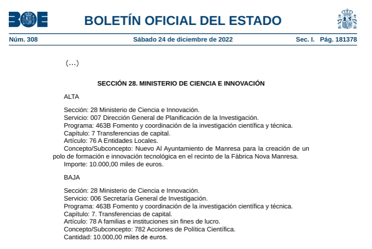 20/12/2022 El Congrés dels Diputats aprova definitivament els Pressupostos Generals de l’Estat de 2023, que inclouen una partida de 10 milions per al projecte de la Fàbrica Nova.