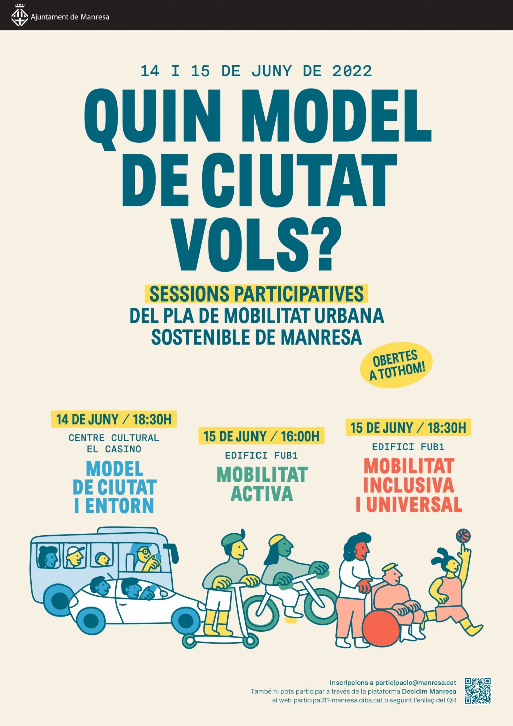 Aquest mes de juny s’obrirà el procés de participació ciutadana per definir el nou Pla de Mobilitat Urbana Sostenible (PMUS) de Manresa, una eina bàsica per a l’administració local per planificar de manera integrada les xarxes que conformen el sistema de transport de la ciutat i la mobilitat de les persones que hi viuen, tenint en compte tots els models que s’utilitzen per als desplaçaments.