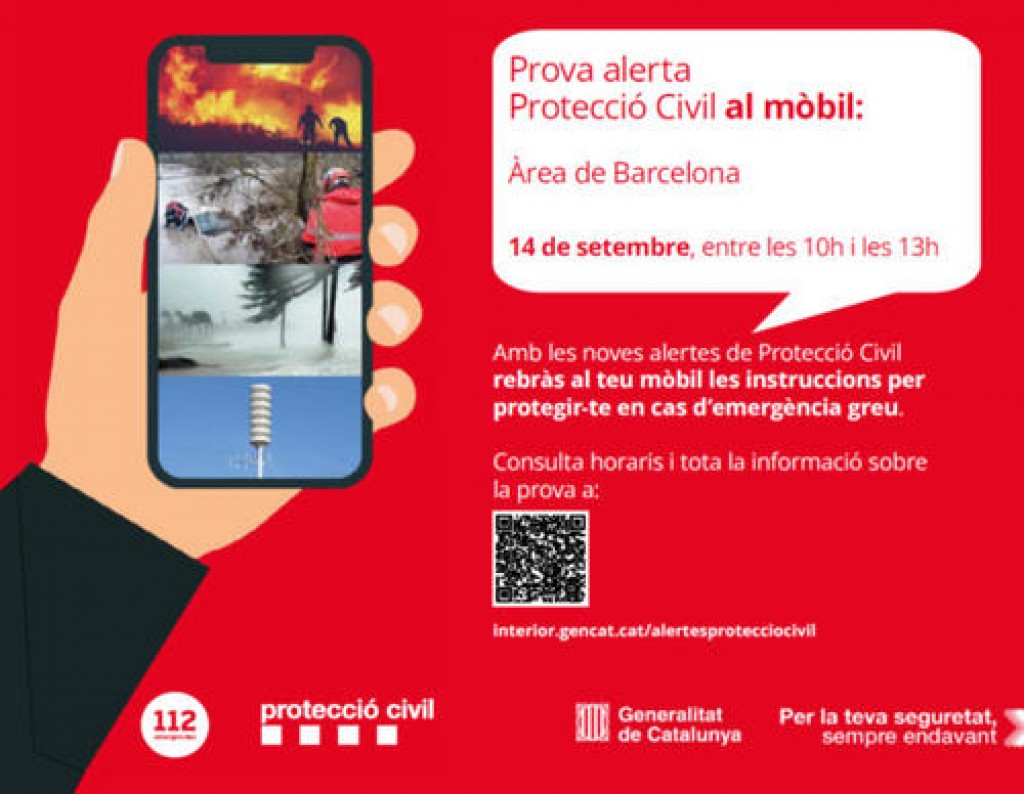 El Centre de Coordinació Operativa de Catalunya (CECAT) de la Generalitat de Catalunya recorda que demà, 14 de setembre, entre les 10 i les 13 h, es realitzarà una prova del Sistema d'Alertes de Protecció Civil per a totes les comarques de la demarcació de Barcelona (Barcelonès, Vallès Occidental, Vallès Oriental, Maresme i Baix Llobregat). Els veïns i veïnes de Manresa, com a municipi proper, també poden rebre la notificació als mòbils, tot i no estar dins de l'àrea de la prova degut a la cobertura de les antenes de telefonia, que poden cobrir més territori dels límits administratius establerts.