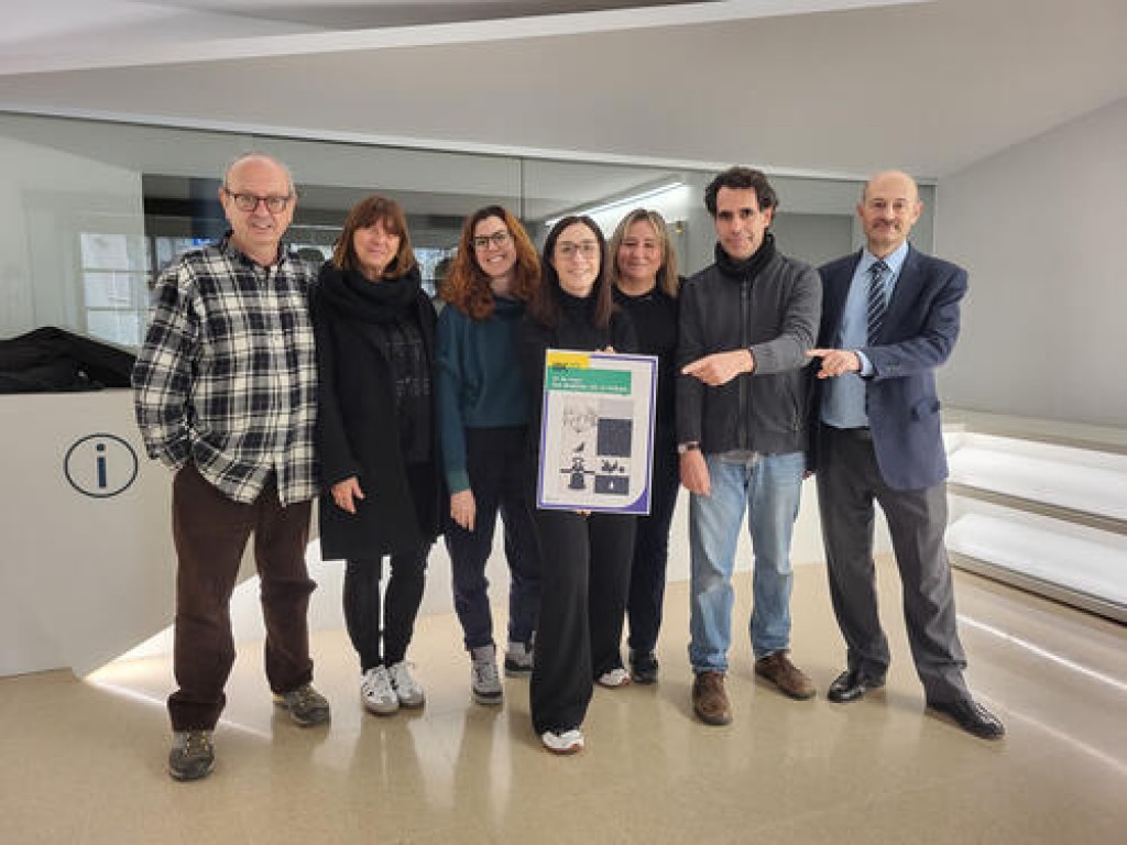 (*) Peu de foto: d'esquerra a dreta, Jordi Estrada, Neus Capdevila, Maria Brioso, Tània Infante, Gerard Muixí i Antoni Duara, amb el cartell del Dia Mundial de la Poesia