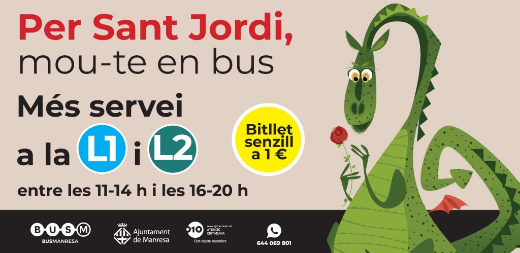 Amb la voluntat d’incentivar que la ciutadania no accedeixi al centre de Manresa amb cotxe privat el pròxim dimecres, 23 d’abril, dia de Sant Jordi, durant la jornada es reforçarà el transport públic que ofereix Bus Manresa, concretament les línies L1 i L2 La Parada, i el bitllet senzill tindrà un preu reduït d’1 euro.