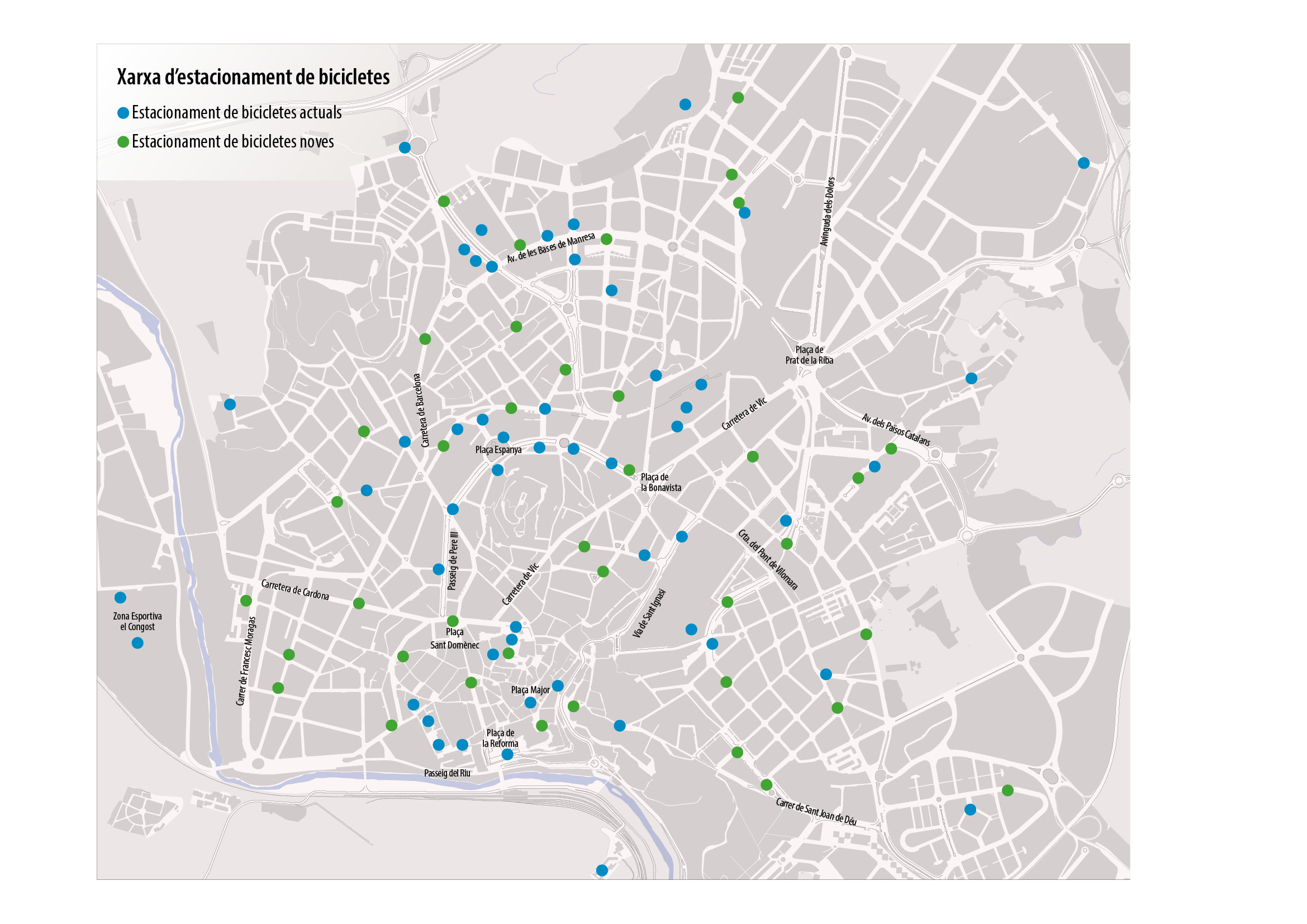 Actualment, la ciutat disposa de 56 estacions de bicicletes amb capacitat per a 336 bicicletes (una estructura metàl·lica permet lligar fins a dues bicicletes simultàniament per forquilla). Amb la instal·lació de 40 noves estacions, cadascuna amb quatre forquilles aproximadament. Un cop finalitzat el desplegament, Manresa tindrà 96 zones d’aparcaments per a bicicletes amb una capacitat total per a 736 bicicletes.