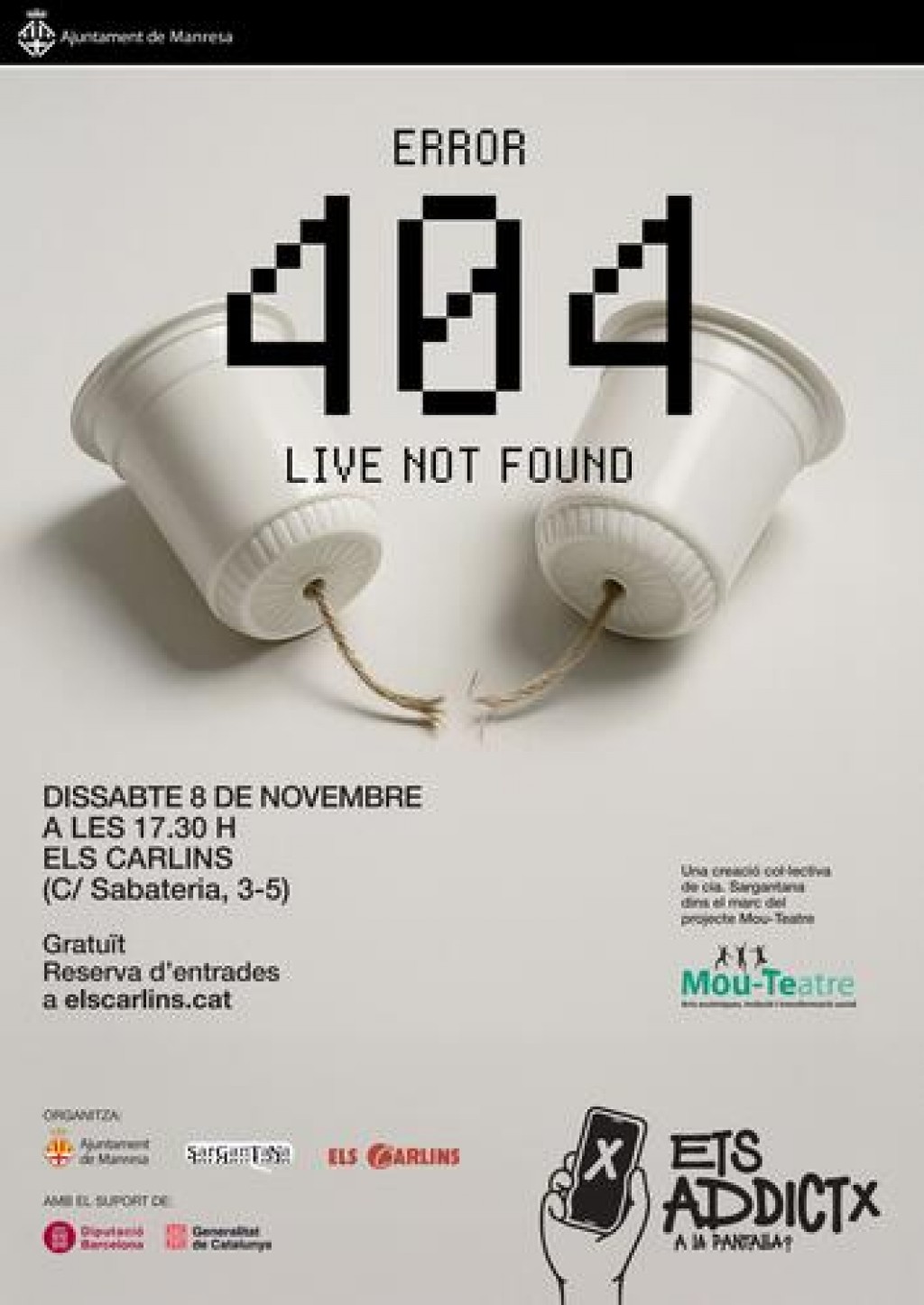 El dissabte 8 de novembre, el projecte MOU-TEatre. Arts escèniques, inclusió i transformació social torna a l’escenari amb la seva nova creació basada en una reflexió entorn les pantalles. Sota el títol “Error 404 Live not found”, es tracta d’una obra col·lectiva que suma testimonis, vivències i anàlisi per tal d’apropar-nos a un tema que està al dia a dia de tots i totes nosaltres.