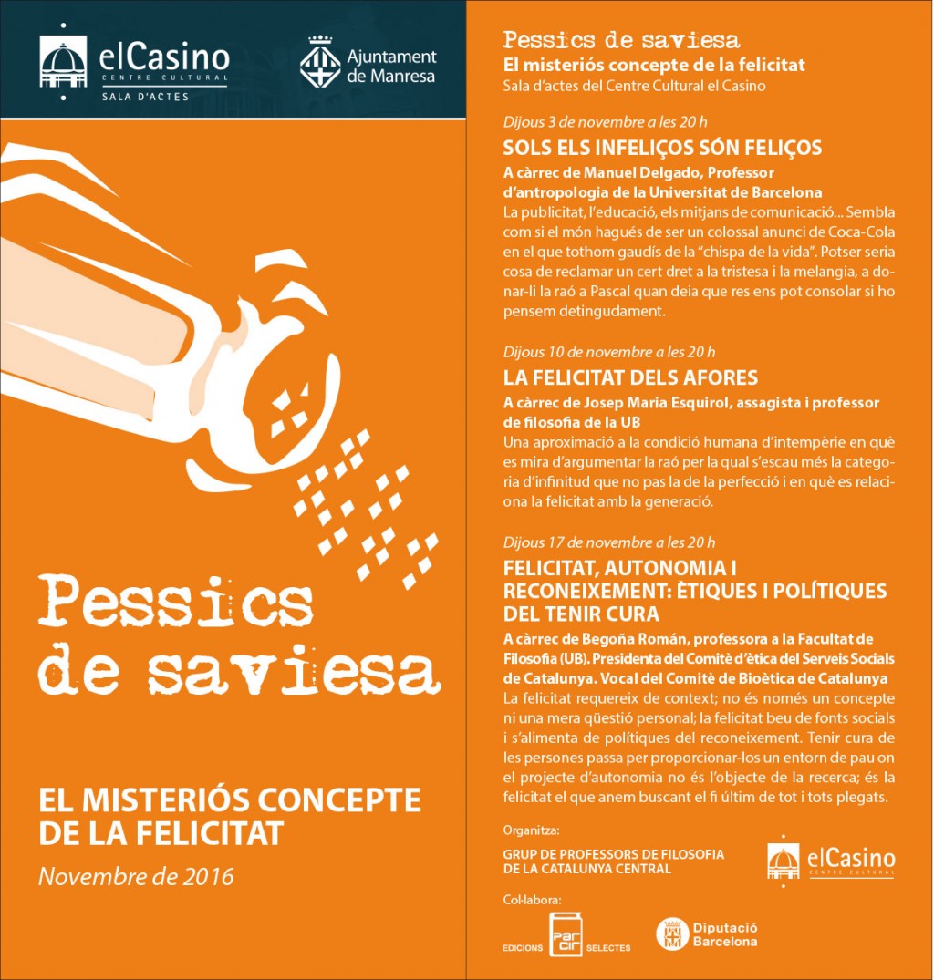 01/11/2016Els dies 3, 10 i 17 de novembre, Manel Delgado, professor d’antropologia; Josep Maria Esquirol, recentment guardonat amb el Premio Nacional de Ensayo; i Begoña Román, professora de filosofia, posaran llum i contingut a un dels conceptes més abstractes que l’ésser humà persegueix des de tots els temps: la felicitat.