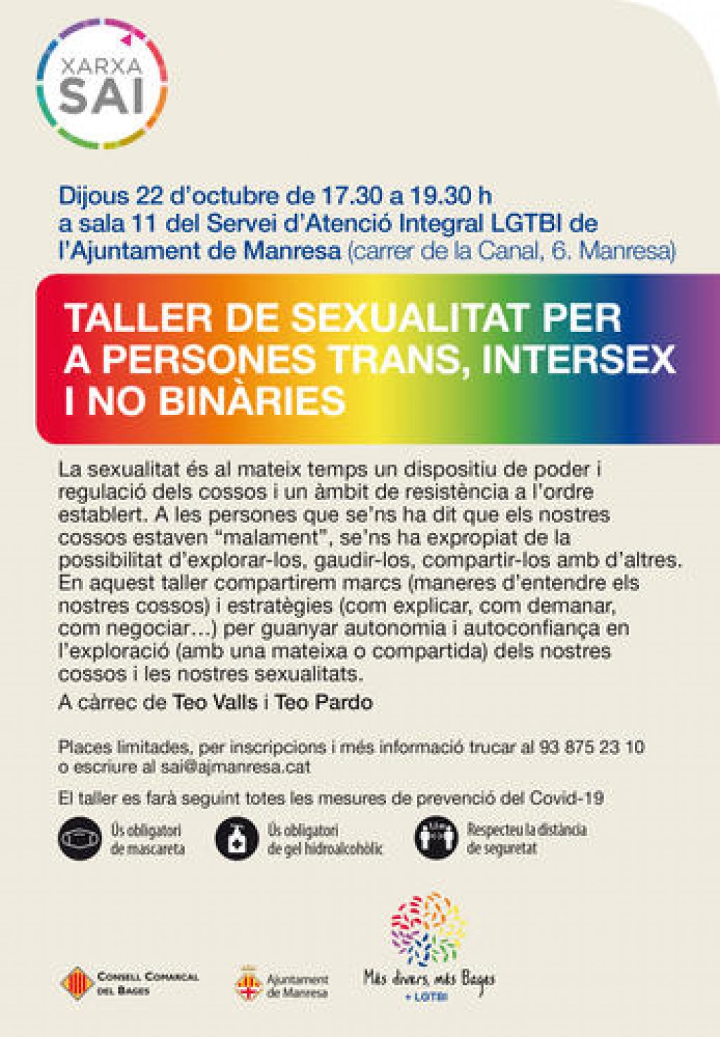 El pròxim dijous 22 d’octubre (de 17.30 a 19.30 h) es realitzarà el primer taller de sexualitat dirigit a persones trans, intersex i no binàries del Bages. Aquest taller, promogut des del SAI LGTBI de Manresa i el SAI LGTBI del Bages, es portarà a terme a la sala polivalent ubicada al carrer de la Canal núm. 6 de Manresa i estarà coordinat per Teo Valls i Teo Pardo, activistes pels drets de les persones trans i professionals entorn de la diversitat sexual i de gènere, especialitzats en sexualitat.