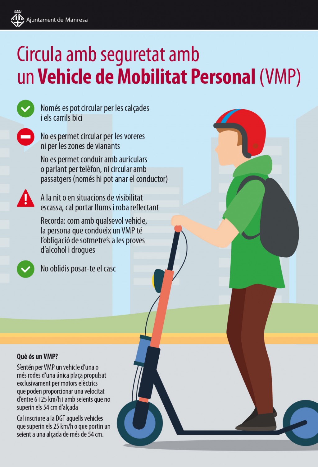L’Ajuntament de Manresa ha iniciat una campanya informativa per donar a conèixer a la ciutadania la nova normativa que cal seguir per circular amb patinets elèctrics, anomenats Vehicles de Mobilitat Personal (VMP). S’ha editat material gràfic que es distribuirà per la ciutat mitjançant diferents suports publicitaris i les xarxes socials.