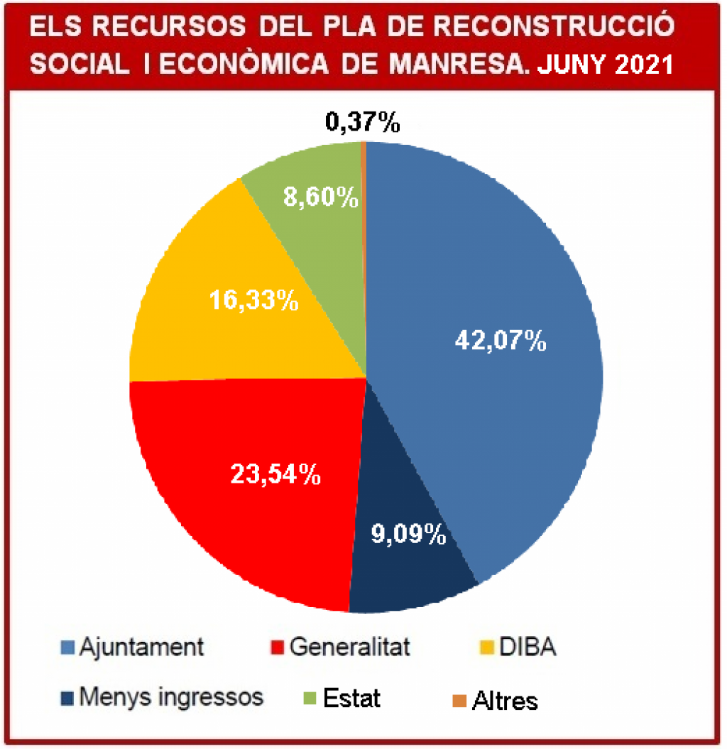 16/06/2021Els grups municipals reunits a la Junta de Portaveus acorden el tancament del Pla de Reconstrucció Social i Econòmica de Manresa, que va començar a caminar el maig de 2020, en plena pandèmia del coronavirus. L'últim informe de seguiment del Pla, que s'ha presentat al Ple aquest dijous, constata que s’hi han destinat 6.070.801,32 euros i que l'Ajuntament ha estat l'administració pública que més cost ha assumint del Pla amb un 51,16% del total, tot i que aquest mes l'estat ha guanyat protagonisme amb una aportació de 515.997,17 euros per compensar les pèrdues del bus urbà per la caiguda d'usuaris durant la crisi sanitària.