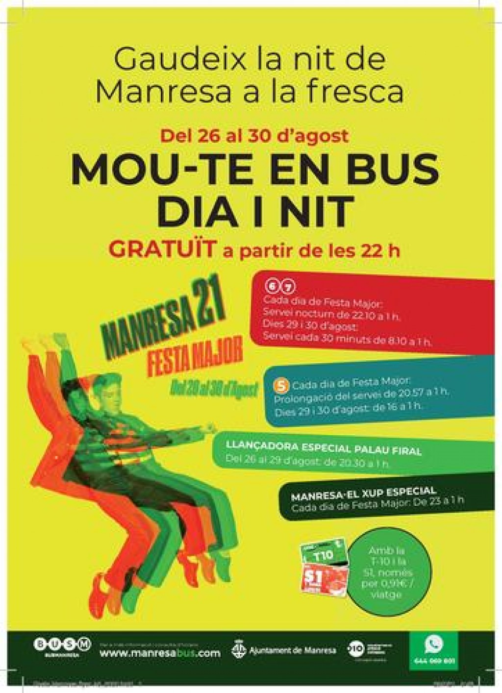 Els viatges en el servei de bus nocturn són gratuïts a partir de les 22 h en totes les línies. En la mateixa campanya s’informa els usuaris no habituals del bus que l’utilitzin per moure’s pels diferents actes de la Festa Major, que per tal que el viatge sigui més econòmic poden utilitzar els diferents títols de transport disponibles, com les targetes T10 o S1 (aquesta segona exclusiva de la línia del Xup).