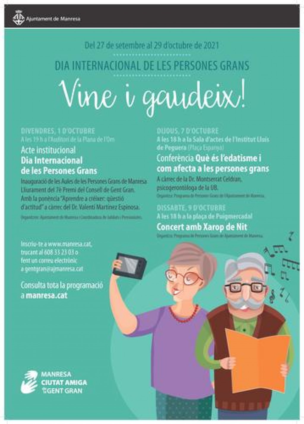 Manresa ja ho té tot a punt per a la celebració del Dia Internacional de les Persones Grans amb una nova edició del programa d’actes que tindran lloc del 27 de setembre al 29 d’octubre, i que estarà format per una vintena d’activitats impulsades per l’Ajuntament de Manresa amb la col·laboració de les entitats de la ciutat.