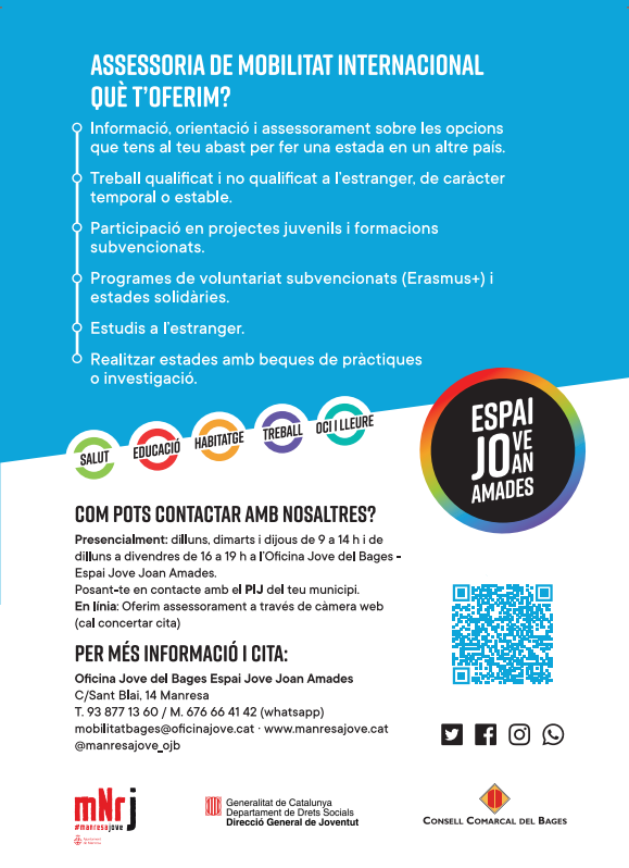 L’Oficina Jove del Bages, impulsada per Direcció General de Joventut i gestionada per l’Ajuntament de Manresa amb la col·laboració del Consell Comarcal del Bages, va iniciar una nova assessoria de mobilitat internacional amb l’objectiu d’informar, orientar i assessorar sobre les diferents opcions que les persones joves tenen el seu abast per fer una estada en un altre país.