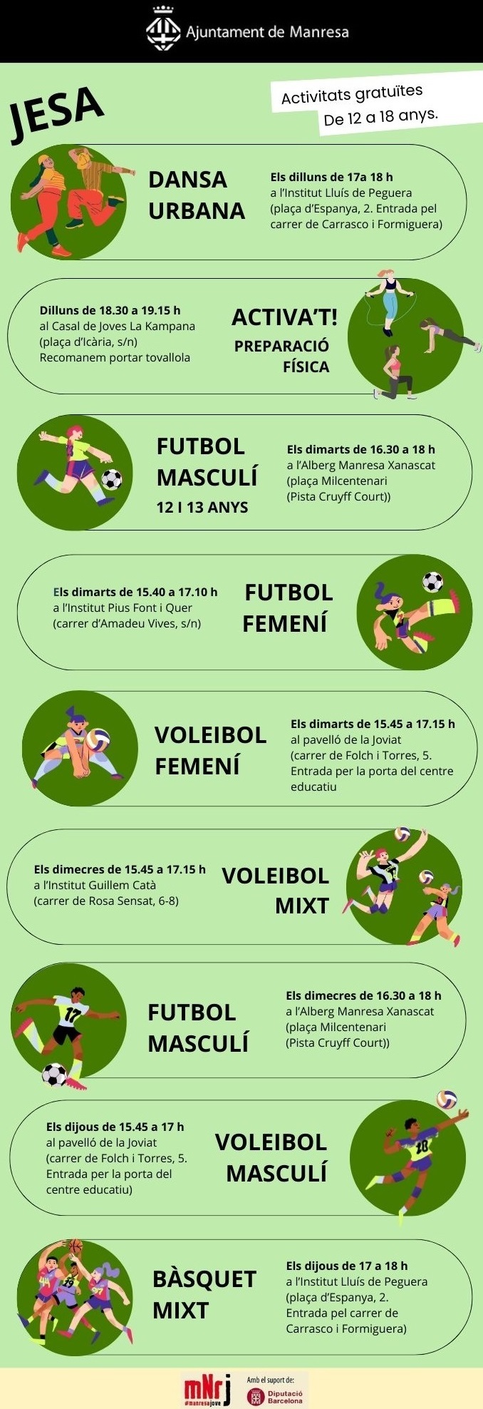 El projecte JESA (Joventut Esportiva, Societat Activa) és una iniciativa de l'Ajuntament de Manresa amb l'objectiu de fomentar l'activitat física entre adolescents i joves de la ciutat dins d'un marc inclusiu, saludable i gratuït.