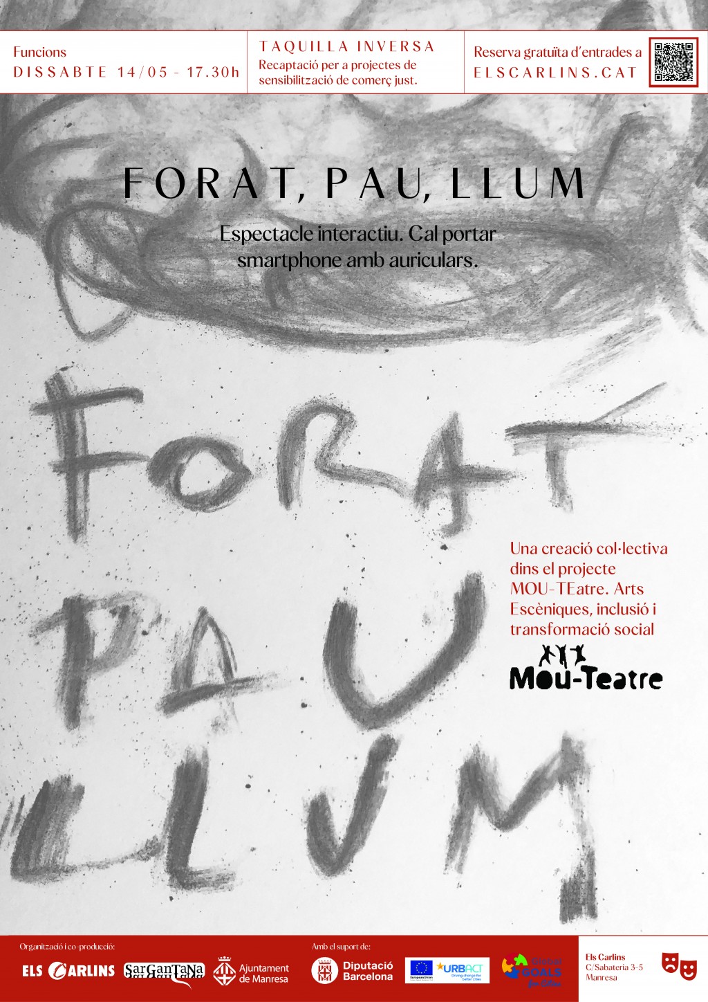 Coincidint amb el Dia Internacional del Comerç Just, el projecte “MOU-Teatre. Arts escèniques, inclusió i transformació social” estrenarà dissabte vinent, 14 de maig, la seva tercera creació, “Forat Pau Llum”. Si en les anteriors edicions es van explorar els processos de refugi i les ombres de la violència de gènere, en aquesta edició s’ha escollit el tema del consum. En el procés d’ideació i creació de l’obra, hi ha participat una trentena de persones, que ha consistit en tres fases: l’intercanvi d’experiències i testimonis; el procés de creació de guió i assaig, i la representació i debat final.