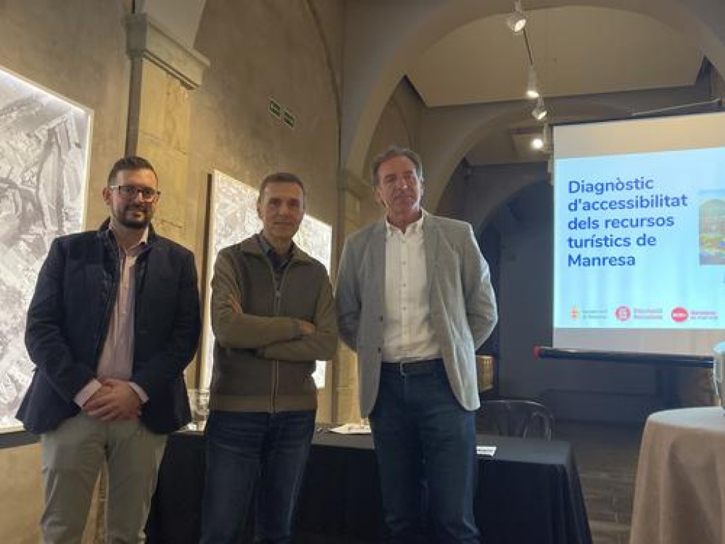 L’Ajuntament de Manresa destinarà un total de 823.333 euros —provinents dels fons europeus Next Generation en el marc del Pla de Recuperació, Transformació i Resiliència (PRTR)— a actuacions i intervencions per fer passos decisius cap a l’accessibilitat universal als equipaments turístics de la ciutat. Així ho ha explicat aquest matí el regidor de Turisme i Projecció de Ciutat, Joan Calmet Piqué, en una roda de premsa que també ha comptat amb Xavier Font Urgell, cap de l’Oficina Tècnica de Turisme de la Diputació de Barcelona, i Miguel Carrasco, director tècnic de l’Àrea d'Accessibilitat Universal, Turisme i Cultura Inclusiva de Predif-Tur4all, empresa autora de l’estudi —finançat per la Diputació— que ha permès diagnosticar l’estat de l’accessibilitat dels equipaments i itineraris turístics de Manresa.