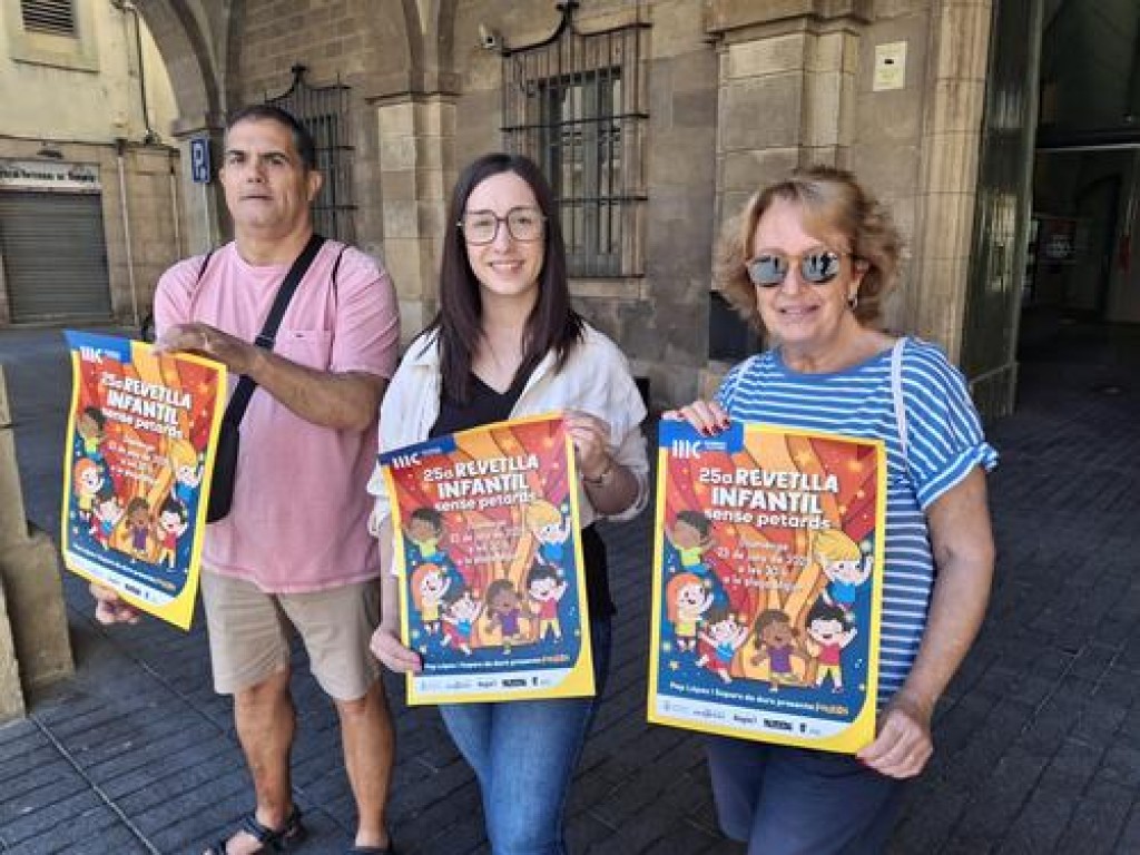 (*) Peu de foto: La regidora de Cultura, Tània Infante Martínez, amb els representants d’Imagina’t, Joan Vilà Ascón i Fina González Valls, mostrant el cartell de la 25a edició de la Revetlla sense petards