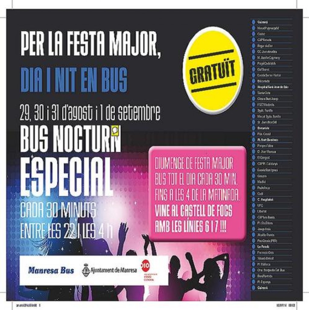 12/08/2014L’Ajuntament de Manresa ofereix bus nocturn de Festa Major els dies 29, 30 i 31 d’agost i 1 de setembre. El servei de bus urbà nocturn és gratuït fins a les 4 del matí, amb freqüències de 30 minuts.