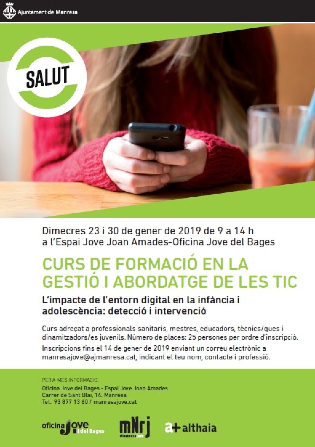 Les regidories de Salut i Joventut de l’Ajuntament de Manresa han organitzat el curs de formació en la gestió i abordatge de les TIC “L’impacte de l’entorn digital en la infància i l’adolescència: detecció i intervenció”, que s’ha programat davant la preocupació per part de famílies i professionals a l’entorn de la utilització de les noves tecnologies en la infància i adolescència.