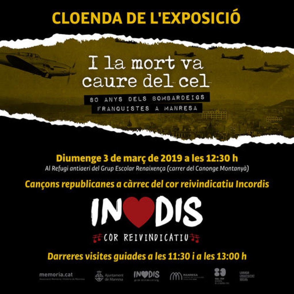 “I la mort va caure del cel”, l’exposició que commemora els 80 anys dels bombardeigs franquistes a Manresa, tanca portes aquest diumenge 3 de març. Com a acte de clausura es farà un recital de cançons republicanes interpretades pel Cor reivindicatiu Incordis que començarà a les 12.30 h al Refugi Antiaeri del Grup Escolar Renaixença, al carrer del Canonge Montanyà.