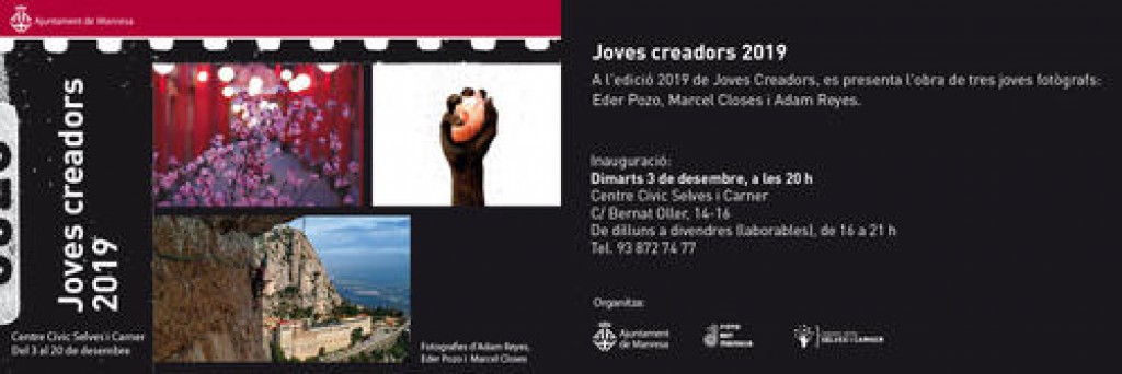 Tres joves fotògrafs exposen les seves obres al Centre Cívic Selves i Carner en el marc de la 14a edició del cicle Joves Creadors, organitzat conjuntament per Foto Art Manresa i la regidoria de Cultura de l’Ajuntament de Manresa. L’exposició s’inaugurarà demà, dimarts 3 desembre a les 20 hores.