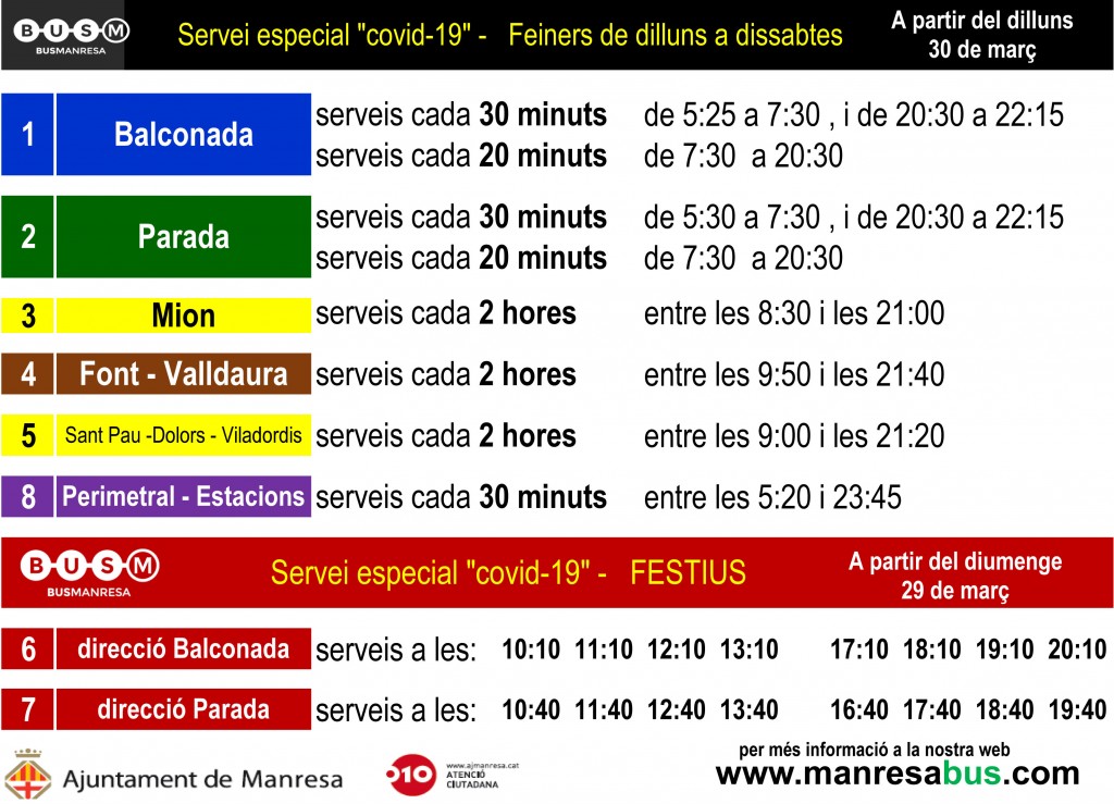 El transport públic de Manresa continua adaptant-se a la situació d'emergència sanitària i a la restricció de mobilitat que estableix l'estat d'alarma a causa del Covid-19. Així, Bus Manresa, conjuntament amb la regidoria de Mobilitat de l’Ajuntament de Manresa, ha decidit ajustar el servei de bus urbà a la ciutat a partir d’aquest diumenge, 29 de març, en el servei de festius, i partir de dilluns, 30 de març, en l’horari de feiners.