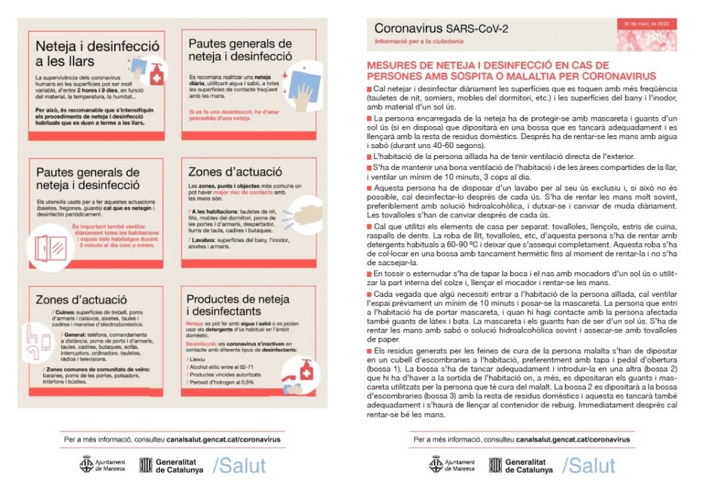 L'Ajuntament de Manresa demana a les famílies manresanes que, en l'actual situació de confinament, intensifiquin els procediments de neteja i dessinfecció a les llars per lluitar contra la propagació del coronavirus, i que segueixin amb el màxim rigor possible les mesures establertes pel Departament de Salut de la Generalitat de Catalunya en aquest àmbit.