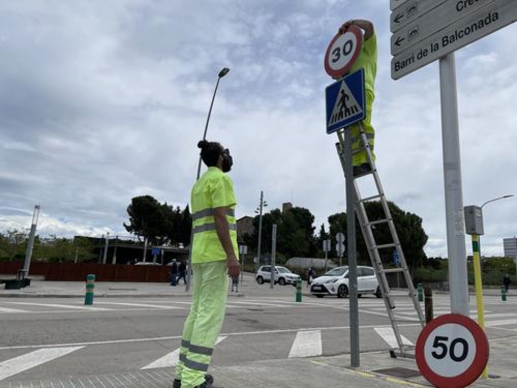 Avui, 11 de maig, ha entrat en vigor arreu de l’estat la nova normativa de trànsit que redueix la velocitat màxima permesa a 30 km/h a la major part dels carrers de pobles i ciutats. Amb aquest objectiu, aquest matí ja han començat a Manresa els treballs de substitució i nova instal·lació de senyalització vertical de límit de velocitat.