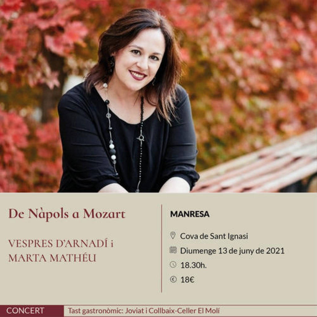 El festival Espurnes Barroques, vinculat amb el projecte Manresa 2022, oferirà aquest cap de setmana els darrers concerts d’aquesta quarta edició. La soprano Marta Mathéu, una de les veus amb major projecció internacional de casa nostra, serà l’encarregada de cloure aquesta edició al costat de l’orquestra barroca Vespres d’Arnadí, dirigida per Dani Espasa, a les 18.30 h. a La Cova de Sant Ignasi de Manresa.